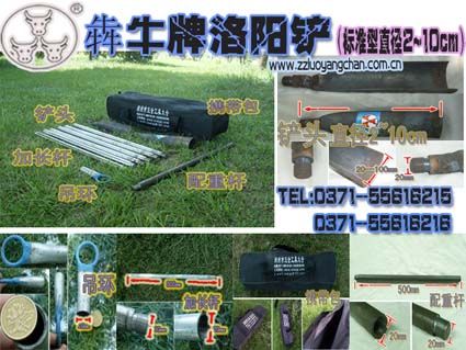 标准型洛阳铲套装:铲头+3米杆+吊环+配重+包,加长杆可以选择3-15米,铲头的直径可以选择2-20cm,即为多款供选,另外如有需要,可根据客户需求,定制打造!【联系QQ:1146536321