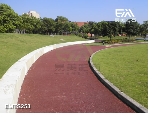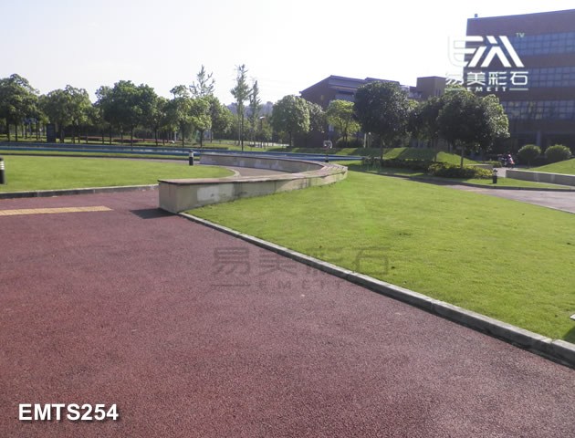 露骨料透水混泥土是使用工程所在地的石子、高标号水泥、EM透水胶凝增强剂、EM彩色混凝土着色剂按规定配比及工艺进行搅拌,现场浇筑摊铺,经养护后喷涂EM混凝土封闭保护剂,含有15%-25%均匀分布的贯通孔隙,集耐用性、装饰性和环保性于一体的整体现浇生态路面。