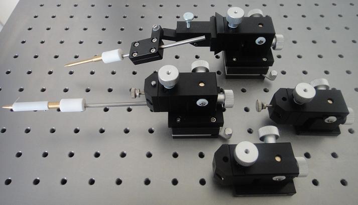 主要有两大类结构,一种是采用高精度交叉滚柱导轨与微分头驱动方式;另一种是采用精密燕尾导轨与精研丝杆驱动。所有产品均是经严格技术标准组装而成,探针定位器精度最高可控制在0.5微米,XYZ三轴运动距离为6.5毫米,13毫米(更远距离可以定制)。其次,我们还根据客户需要设计了探针夹持器,结合不同需求,分为固定夹持器,带有上下俯仰及左右偏摆功能的夹持器。探针定位器底部配有强吸附磁片或可调节磁力底座,方便在各使用场合强效固定,稳定性极好,配有开关的磁力底座还能保证在任何固定需求下轻松调节。