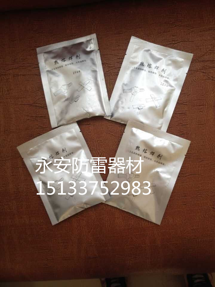 热熔焊剂的使用方法1、将需要进行焊接的两段导线置于热熔模具内,并且将热熔模具合好固定。2、将隔离片(金属)置于热熔模熔膛底部,将导液孔封住3、将防漏袋置于热熔模具的熔膛内,防止热熔焊粉因模具长时间使用后的破损导致的不密实而漏粉。4、将对应的热熔焊剂倒于防漏袋上,并且使用工具将热熔焊粉中间弄成半凹状泊头永安防雷器材有限公司专业生产(方型、圆型、梅花型)接地模块、石墨降阻剂、长效防腐降阻剂、降阻剂、物理降阻剂、石墨接地装置等防雷器材产品,另可为用户提供多种铜包钢、接地极、接地线、铜绞线、BV双色接地专用线、接地专用连接器及放热熔焊接产品,也可承接各类接地防雷工程的设计和安装服务。公司拥有强大的技术力量为国内外客户提供专业的防雷主品及防雷工程的整体解决方案。热忱欢迎各位客户垂询、洽谈、合作并希望与你的良好关系不断巩固、发展!官方网址:http://www.yonganfl.com 电话:15133752983 QQ:2039194723