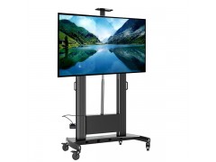 本款推车可悬挂60至100寸电视机,承重为300lbs(136.4kgs)。VESA孔位范围200*200mm到1000*600mm,适合绝大多数60"-100"平板电视使用。支架带有视频摄像头组件的标准配置,满足您视听周边配置的使用。贴心的拉手设计,让您在移动支架的时候使用方便。此款新型产品采用高承重铝合金支柱设计,双立柱结构,完美的内置走线装置,四个刹车功能的高承重万向调节轮,一体式底座、模组化设计使安装或是拆卸更加快捷方便。合理的包装设计,节省储存空间,降低运输成本。
