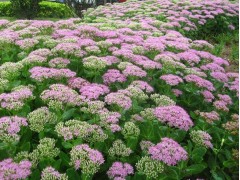 八宝景天,多年生肉质草本植物,株高30~50cm。地下茎肥厚,地上茎簇生,粗壮而直立,呈灰绿色。叶轮生或对生,倒卵形,肉质,具波状齿。伞房花序密集如平头状,花序径10~13cm,花淡粉红色,常见栽培的尚有白色、紫红色、玫红色品种。 花期,7~10月。性喜强光和干燥、通风良好的环境,能耐-20℃的低温;喜排水良好的土壤,耐贫瘠和干旱,忌雨涝积水。植株强健,管理粗放。园林中常将它配合其他花卉布置花坛,花境或成片栽植做护坡地被植物,可以做圆圈、方块、云卷、弧形、扇面等造型。