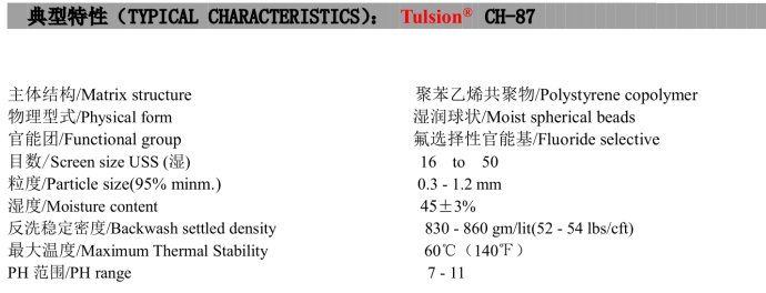 Tulsion CH-87 的去除氟离子的能力可以达到 1ppm 以下的水平。它在中性至碱性的 PH范围内有极高的工作效率,并且很容易再生。