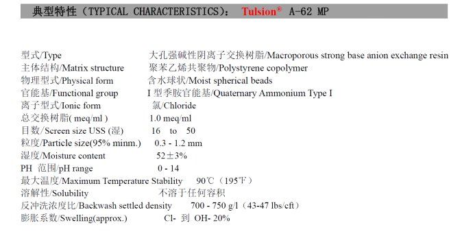 Tulsion A-62 MP 由于其本身的大孔特性而显示出了优越的物理特性和化学稳定性,适合于在广泛的 PH 范围内和温度条件下使用,它在饮用水处理方面可达到食品级的标准。
