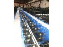 此生产线是生产防火阀的专用成型设备。待加工的带卷用行车借助人工放入放料架上,然后矫正、张紧,经动力调平后,进入液压预冲孔并冲缺口,由导向装置送入成形机进行工件的成形,在经成形辊及压力辊的磨擦阻尼作用下,以0-10m的线速度进入折弯部分后,产品按要求折四个边框并切断,再由人工打包运走。