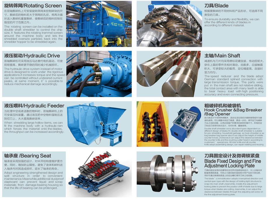 重型双轴撕碎机适合撕碎特大、特厚难碎物料如:电视机、洗衣机、冰箱外壳、中型管材、管件、叉车托板、轮胎、包装桶等,汽车外壳、铝、铜及厚度小于10mm的铁。