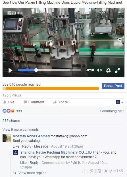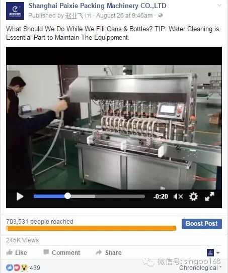 派协拥有精良优质的灌装包装设备,为了让买家看到派协真实的精良产品及设备,在其Facebook运营之初,运营人员就将每日更新发帖的重点放在了派协的产品视频上,而不是密密麻麻的文字介绍和图片展示上,让老外一打开就能迅速看到高质量的灌装设备和产品的生产过程,这对于在海外知名度并不高的公司而言,效果非常明显,很快就获得很多亚非拉市场买家的咨询和采购。